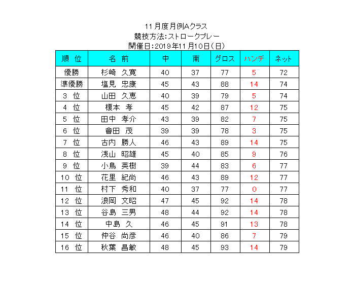 11月度月例Aクラスの競技結果を公開しました